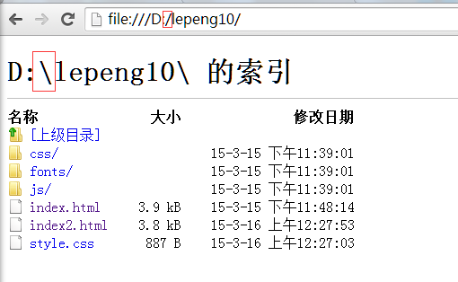 如上图,D:\lepeng10这个路径就是一个绝对路径。完全满足了我们上面提到的两个要求。在这个例子中,假如我们要访问css里面的文件,路径该怎么写?很显然答案就是:D:\lepeng10\css。